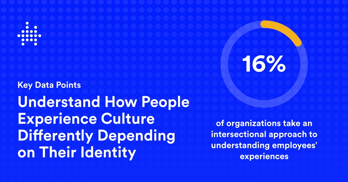 In our work across company sizes and industries, we’ve seen that differences in experience are very common. By analyzing survey data by demographics, and including a wide range of identities in this analysis, organizations can build an understanding of gaps in experience to enhance employee satisfaction and create meaningful progress in the workplace.