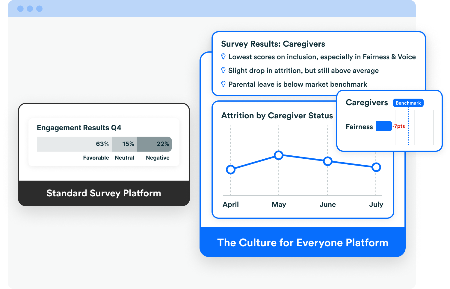 - Benefits, policies & processes: Do low perceptions of fairness map to opaque promotion criteria? Are some employees’ experiencing lower sentiment in areas where your benefits are off market, or your policies are less mature?